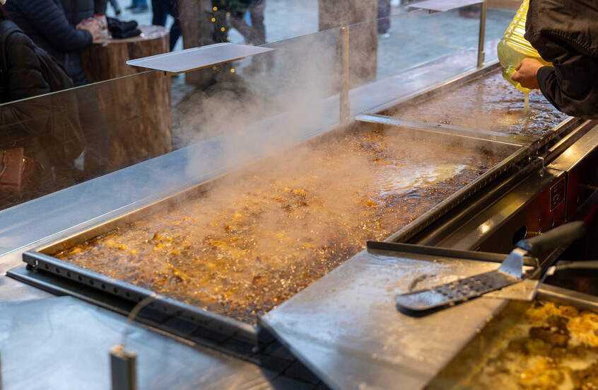 🔸يقوم أحد العاملين بسكب الزيت في الصاج الساخن لتحضير اللحم والصلصة في احد المحال في سوق نورنبيرغ في بافاريا بألمانيا. / Globallookpress🔸